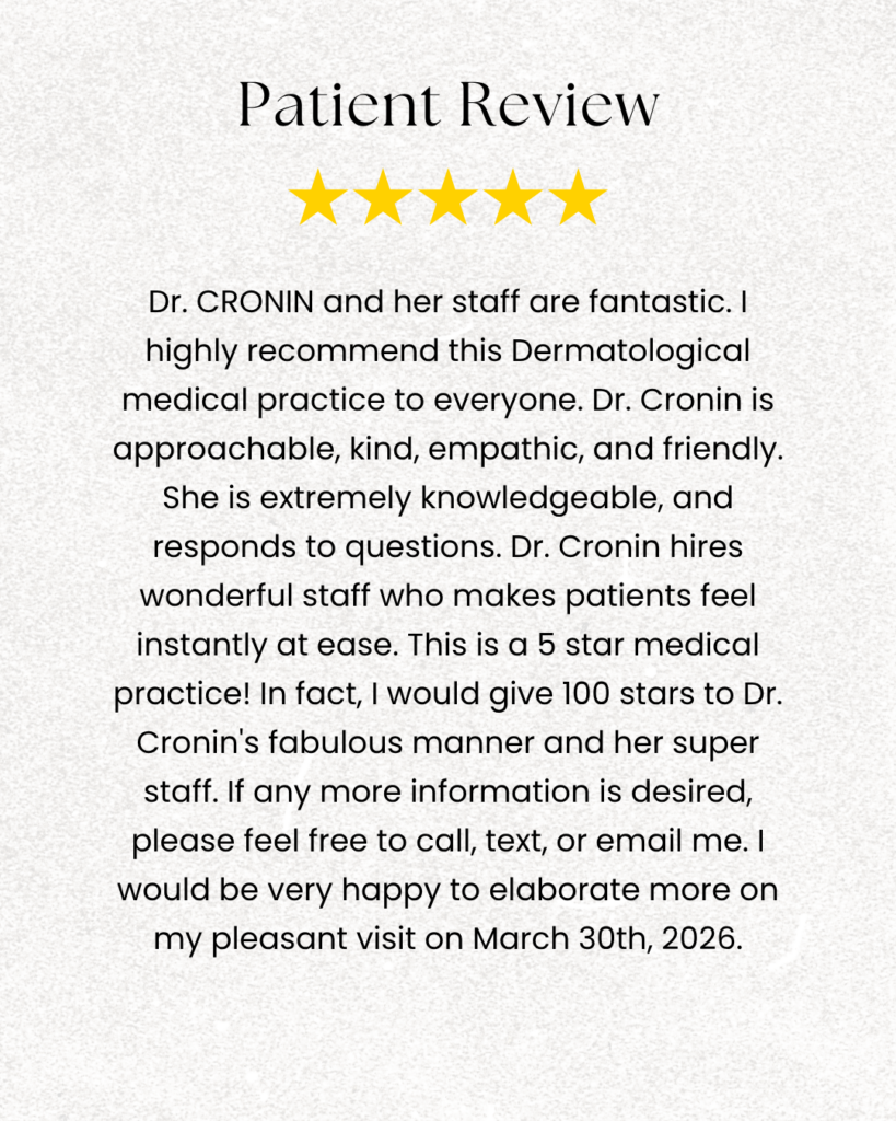 Dr. Cronin Dermatology serves a wide-range of medical, cosmetic and procedural dermatology. We specialize in procedures, including laser treatments and Mohs surgery. We specialize in cosmetic dermatology procedure such as surgical scar treatments, acne scar treatment, and anti-aging. Our practice offers a one-on-one consultation with Dr. Cronin that allows us to go into detail on your medical concerns and cosmetic goals.